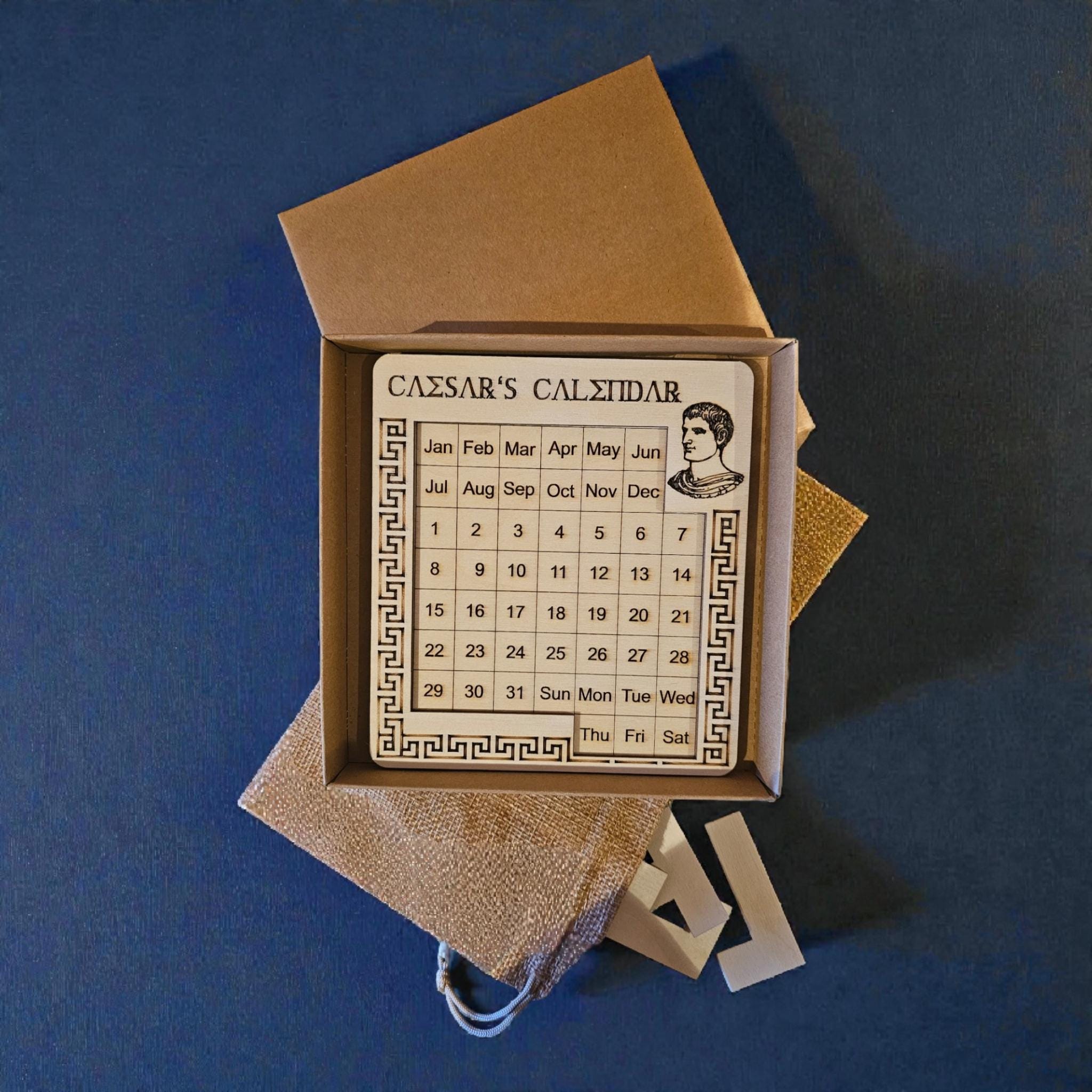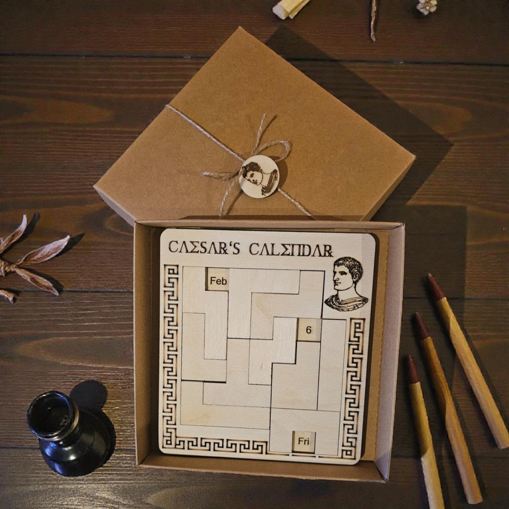 The Caesar Calendar Wooden Puzzle is a captivating puzzle crafted using precise laser-cutting technology. With its unique design, this puzzle is not only an entertaining challenge but also a decorative element for any room. Perfect for puzzle lovers and riddle enthusiasts, this high-quality game offers hours of enjoyment while promoting concentration and fine motor skills. Treat yourself to this special puzzle experience and bring an exciting challenge into your everyday life with the Caesar Calendar Wooden Puzzle.
